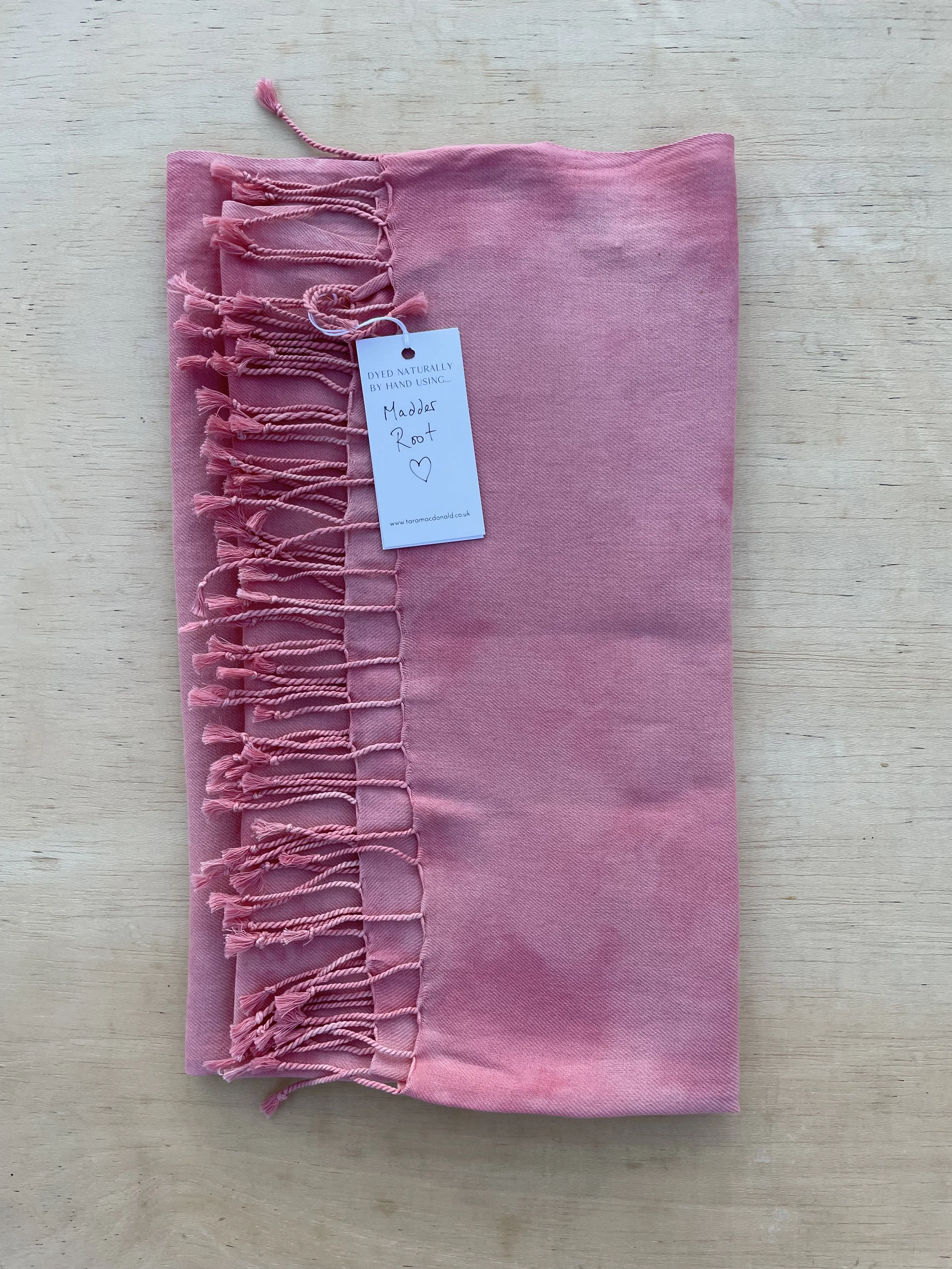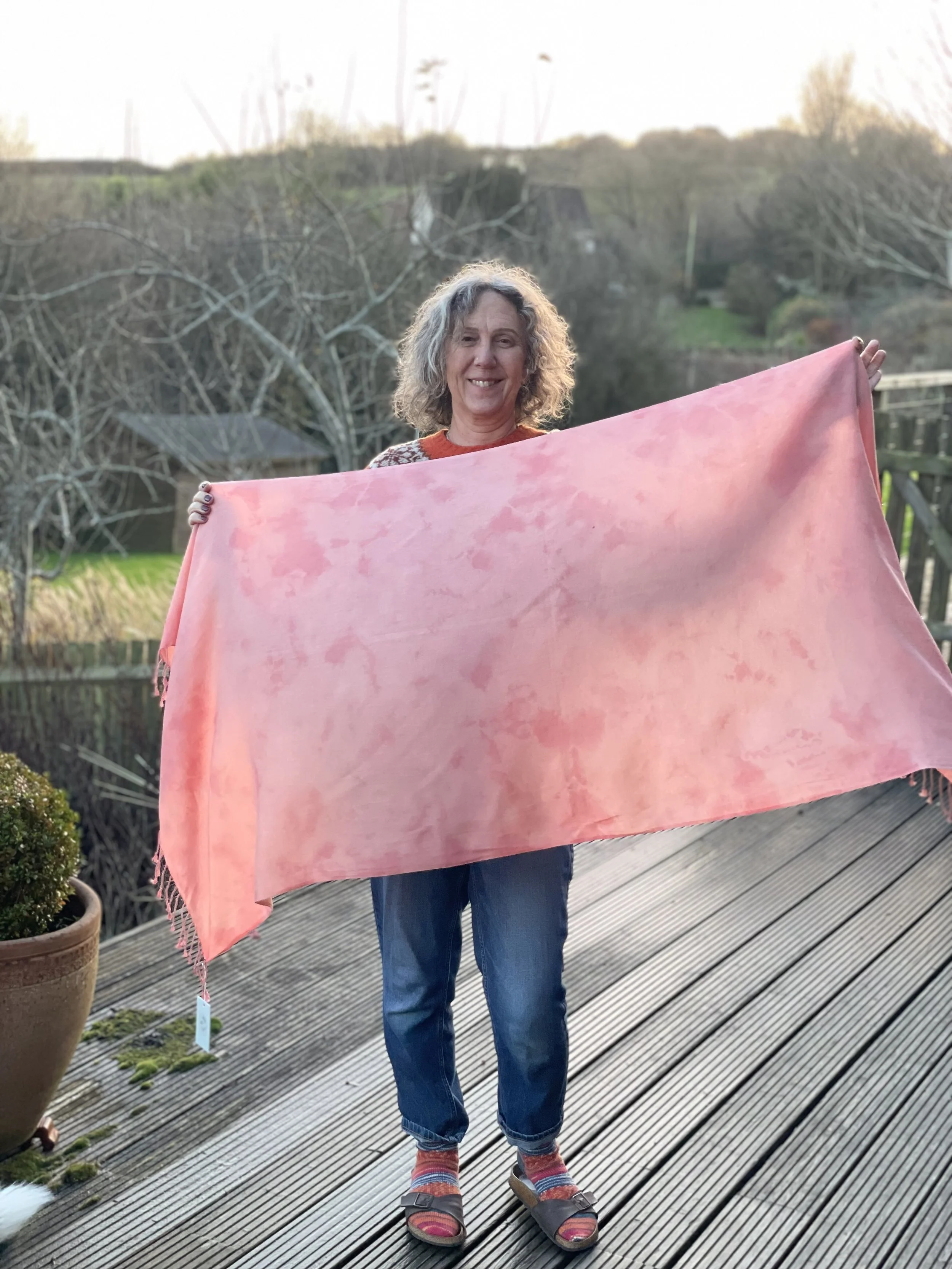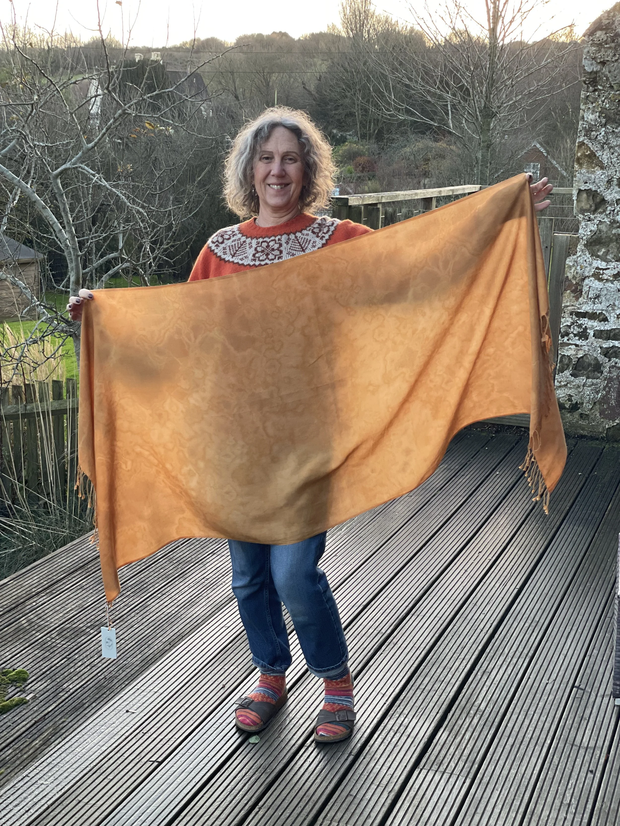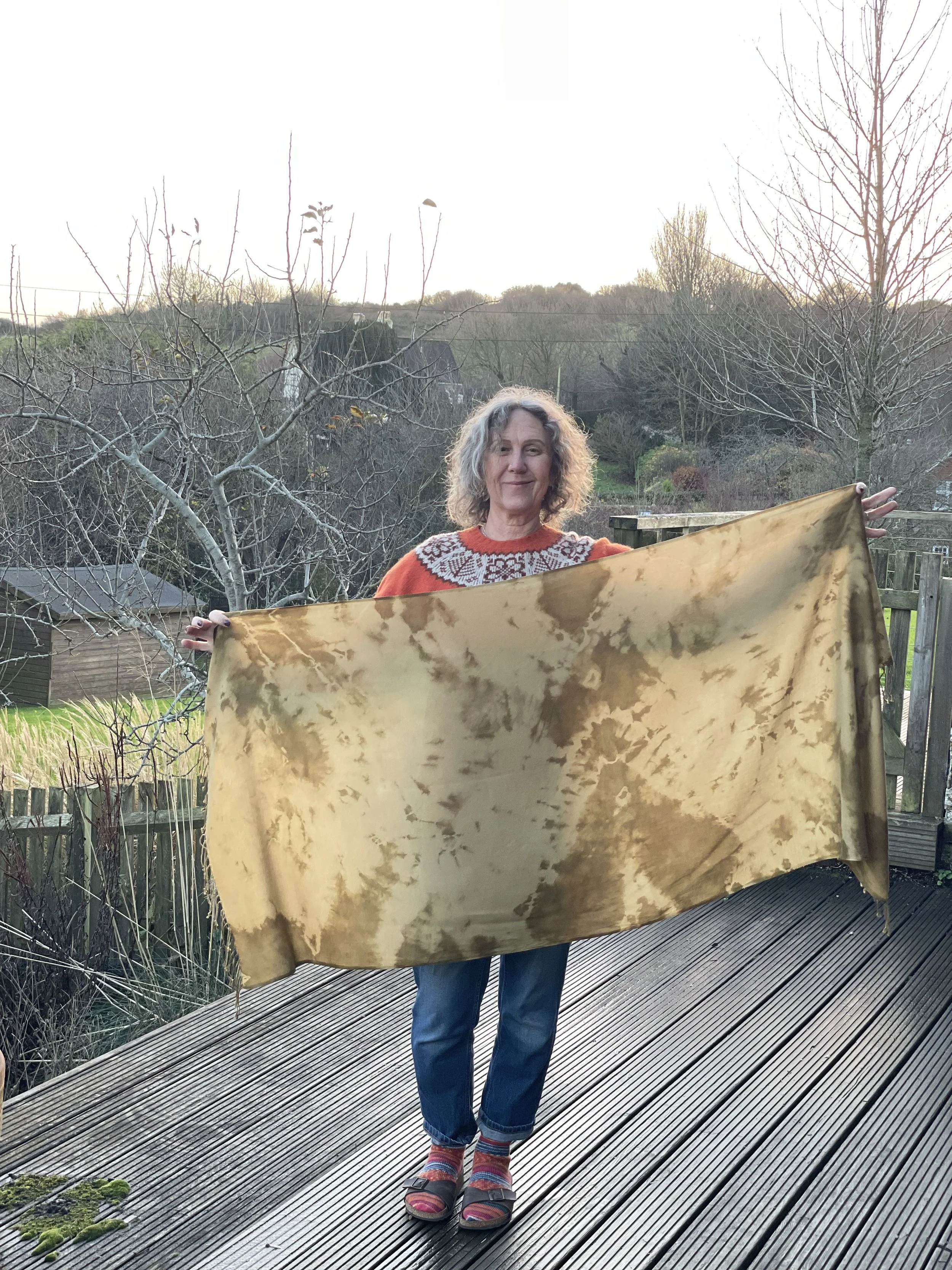 Lovely large and super soft organic cotton scarf naturally dyed in a tie dye effect with Indian Cutch and Iron. Indian Cutch is an ancient dye extracted from an Acacia tree, giving browns and chestnuts.