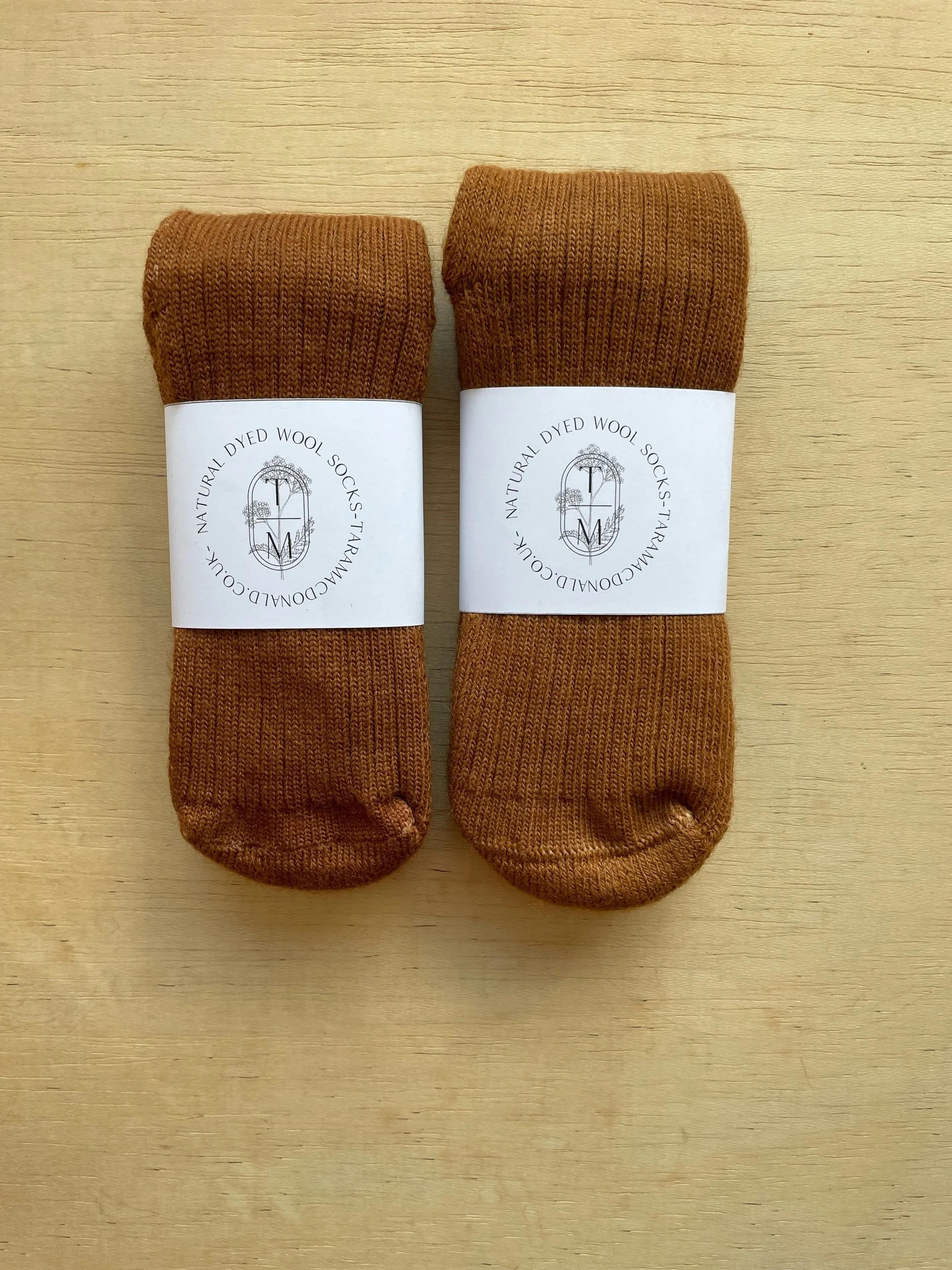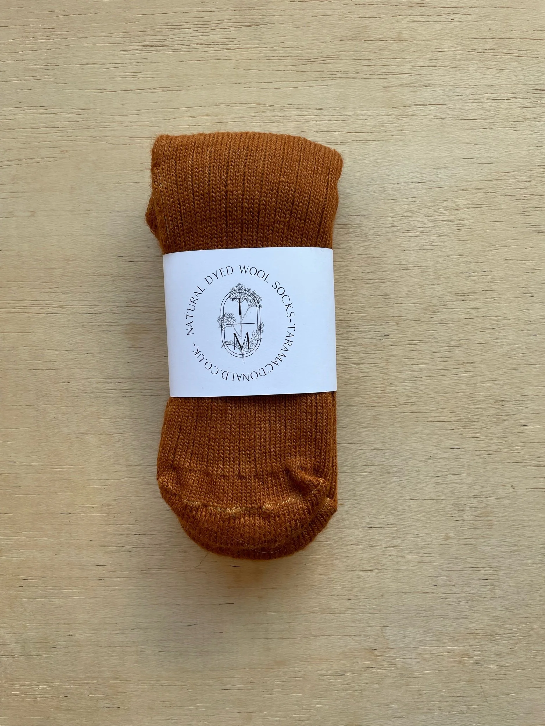 Warm, soft and really comfortable these cushioned wool socks will see you through the winter. These have been naturally dyed with Coreopsis flowers giving a warm burnt orange for style as well as comfort.