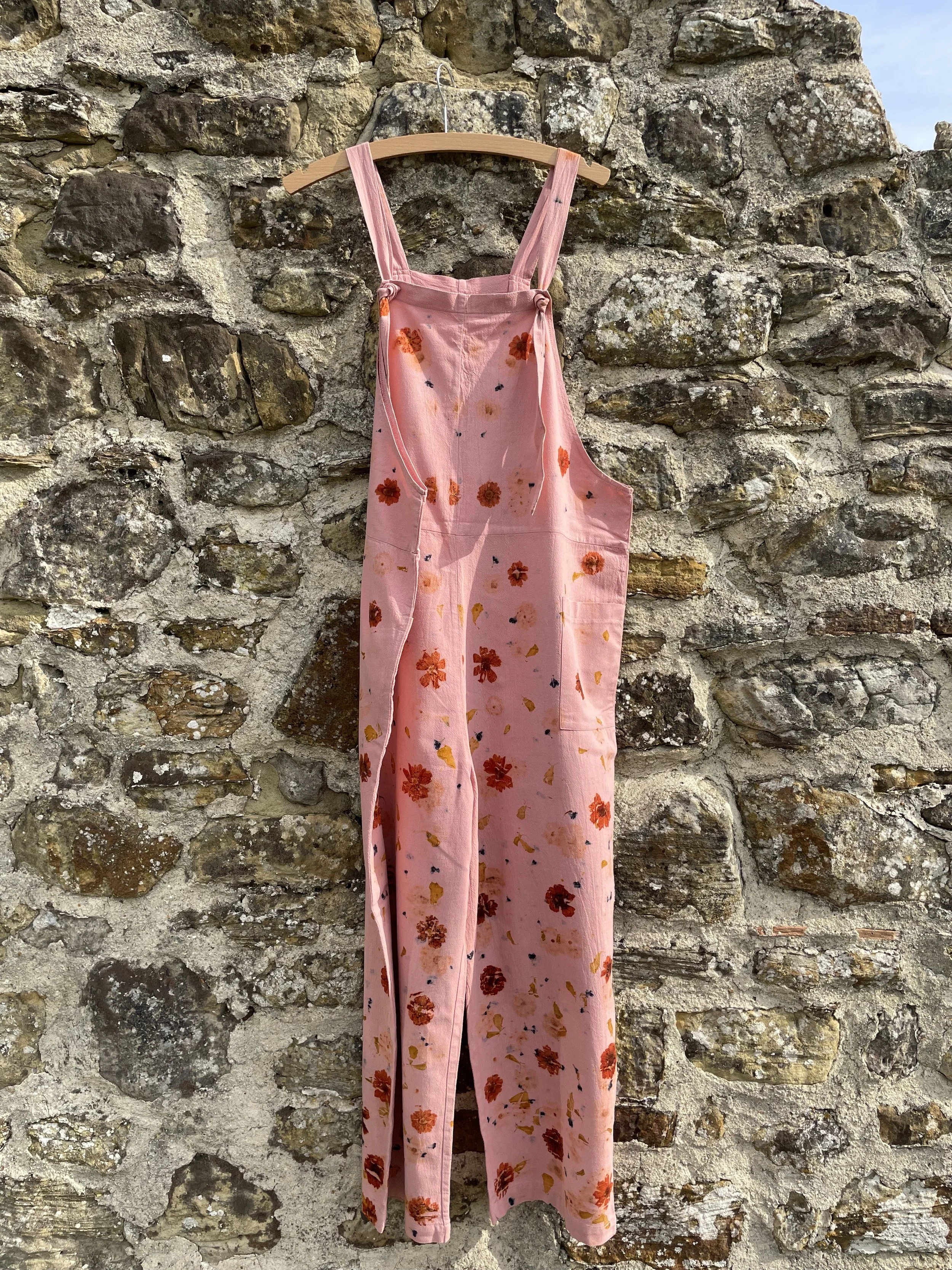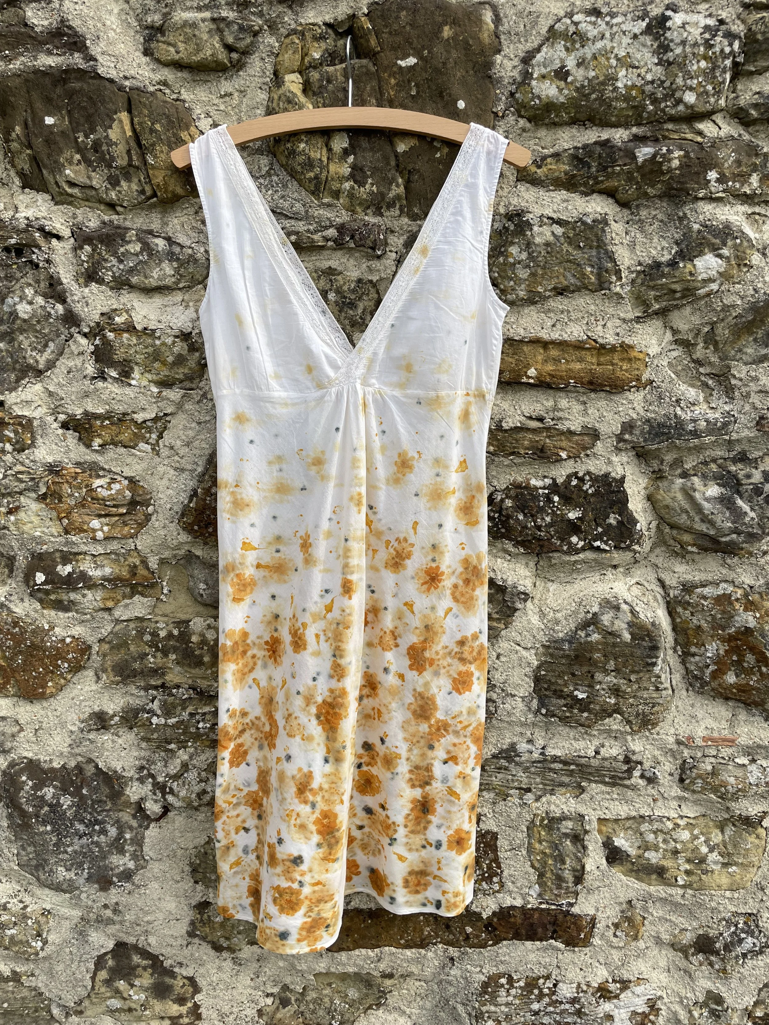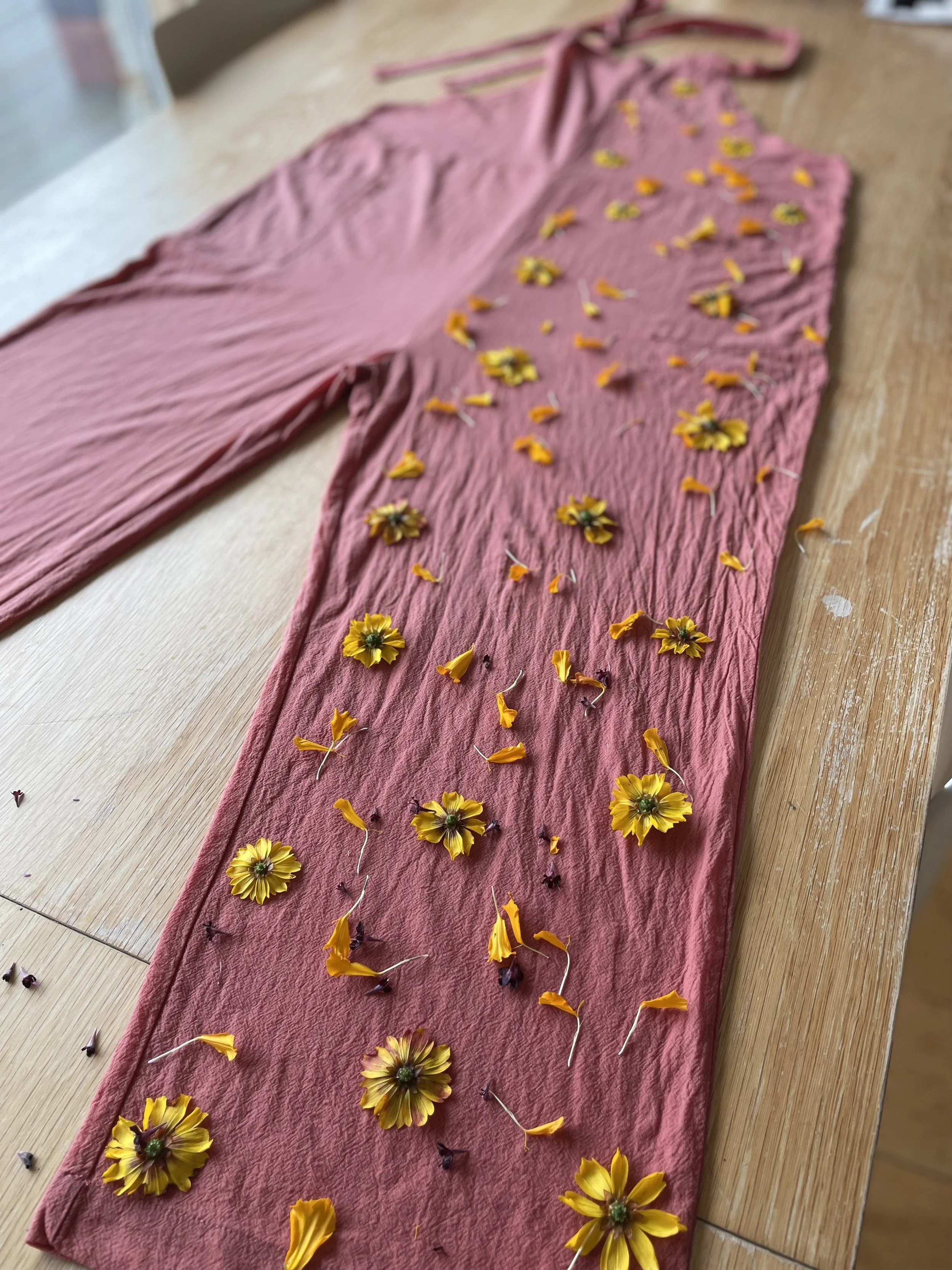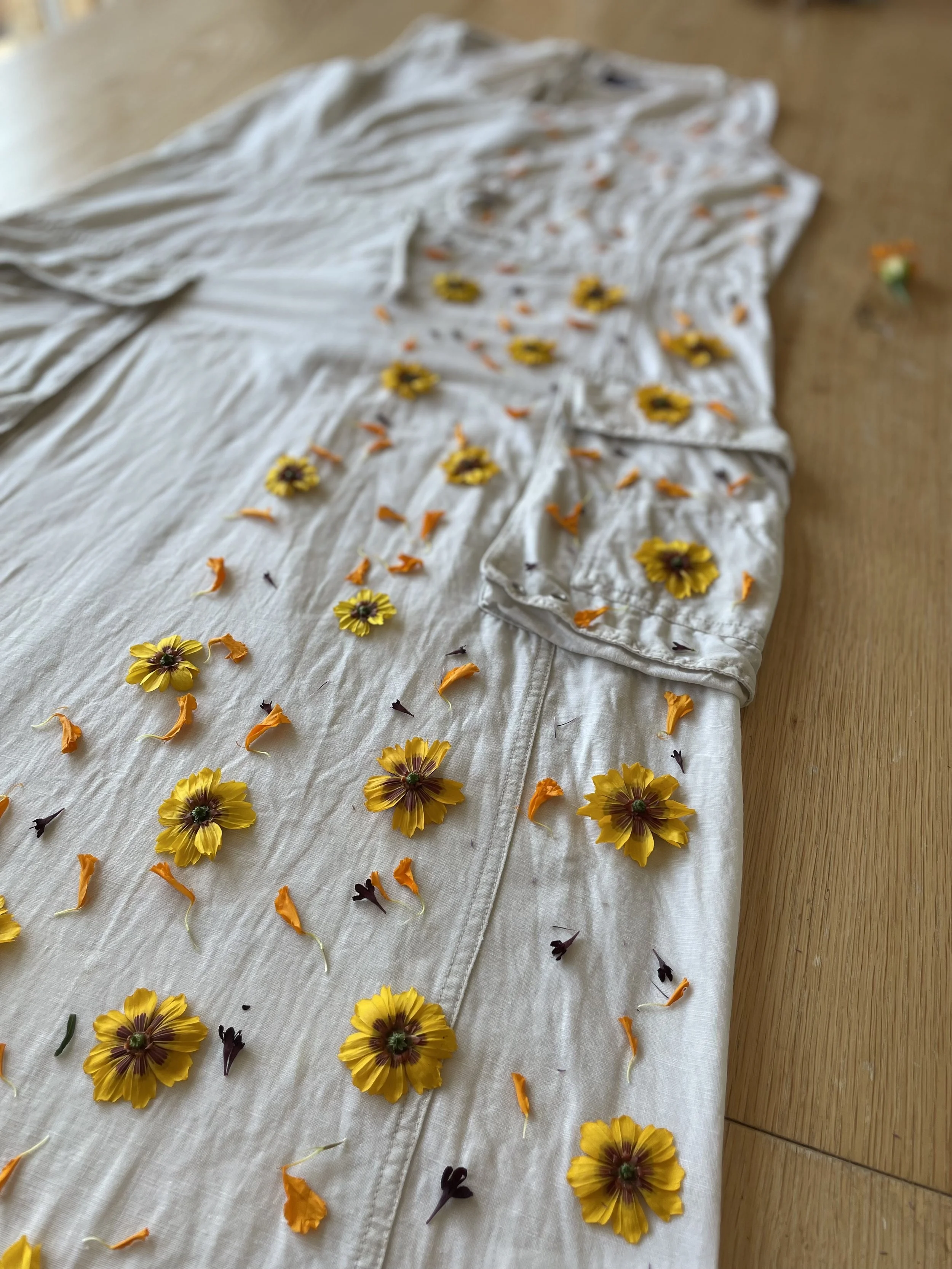 This 100% cotton T shirt has been given a new lease of life with flowers! It has been eco printed with just simple Coreopsis flowers, from my dye garden here in Fairlight by the sea.