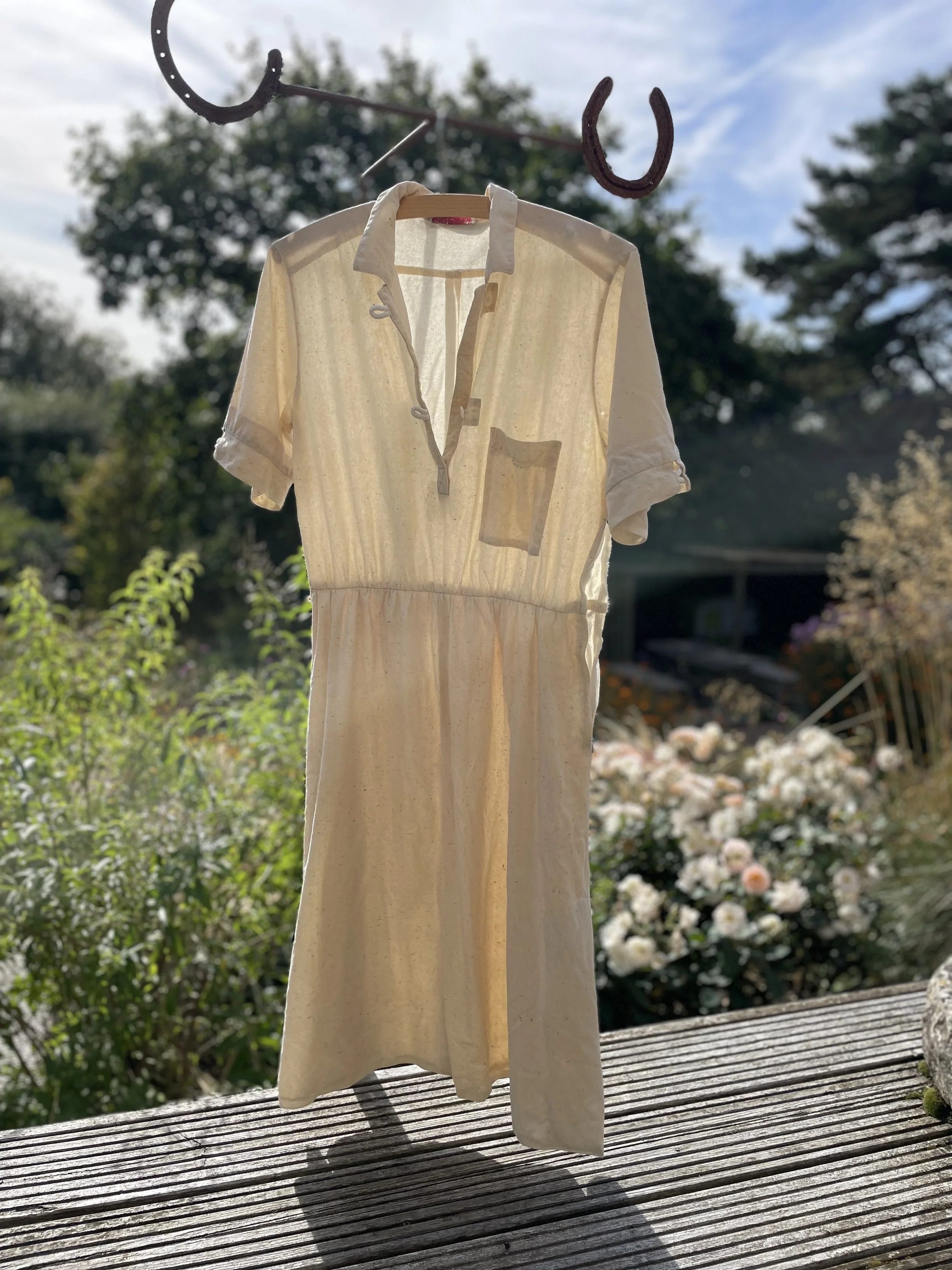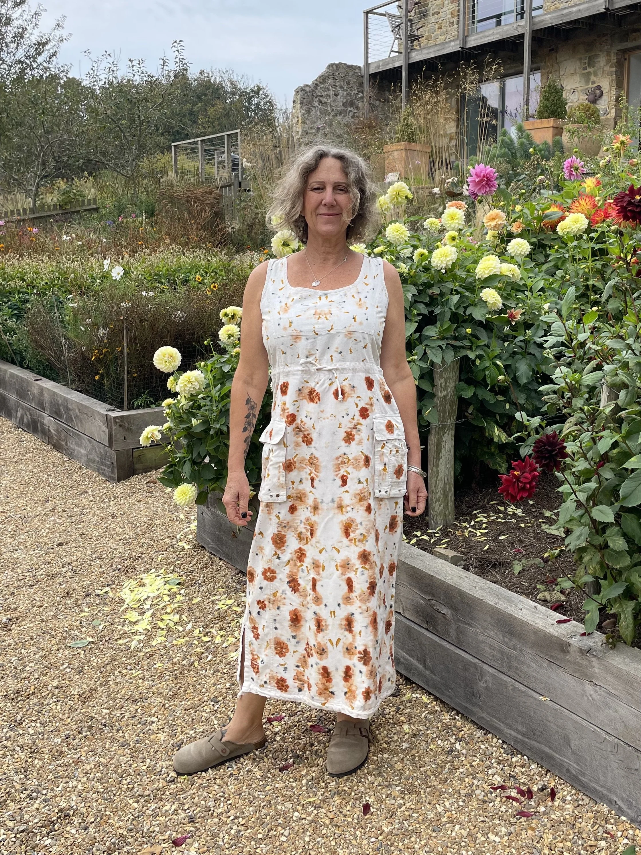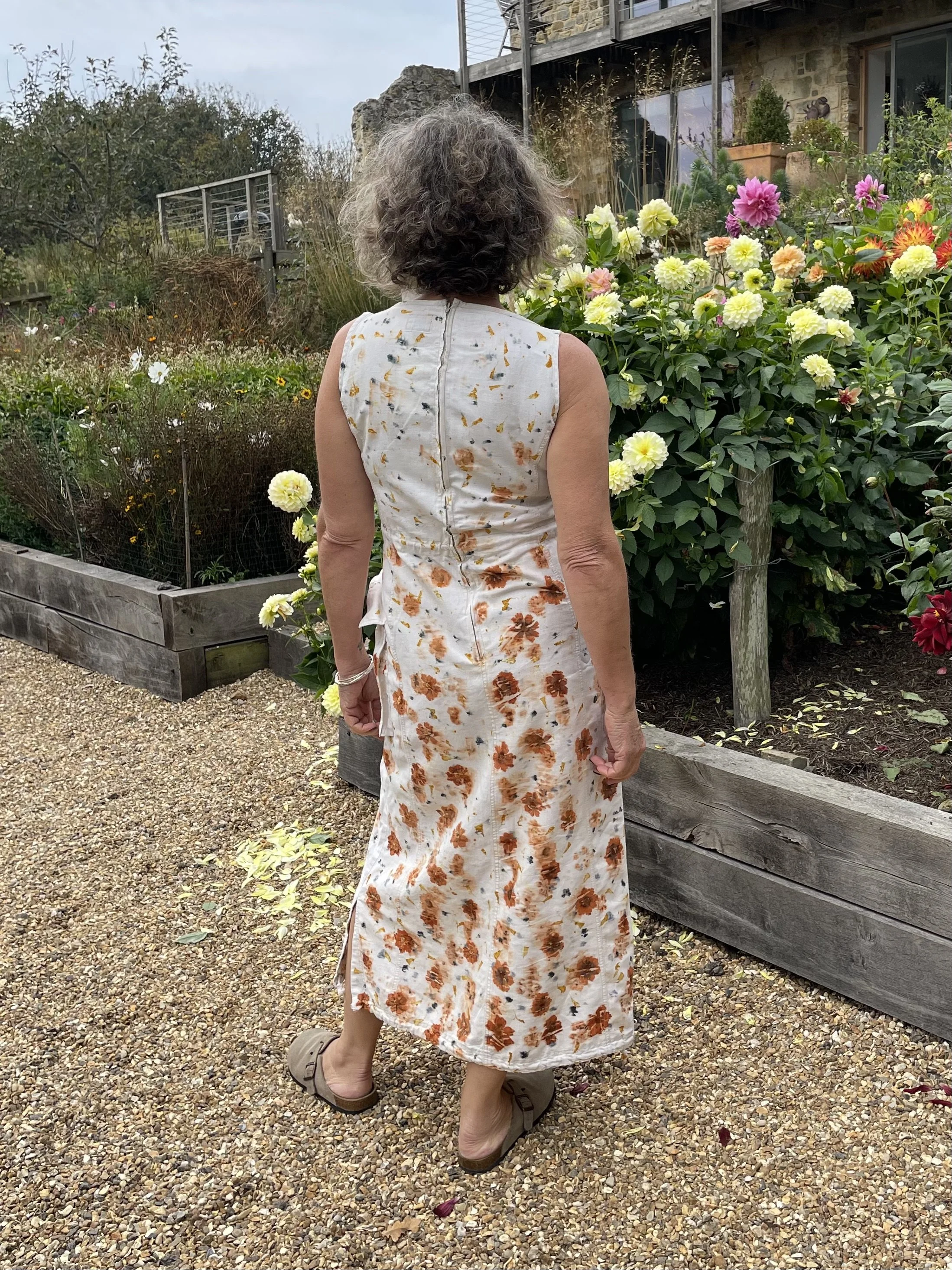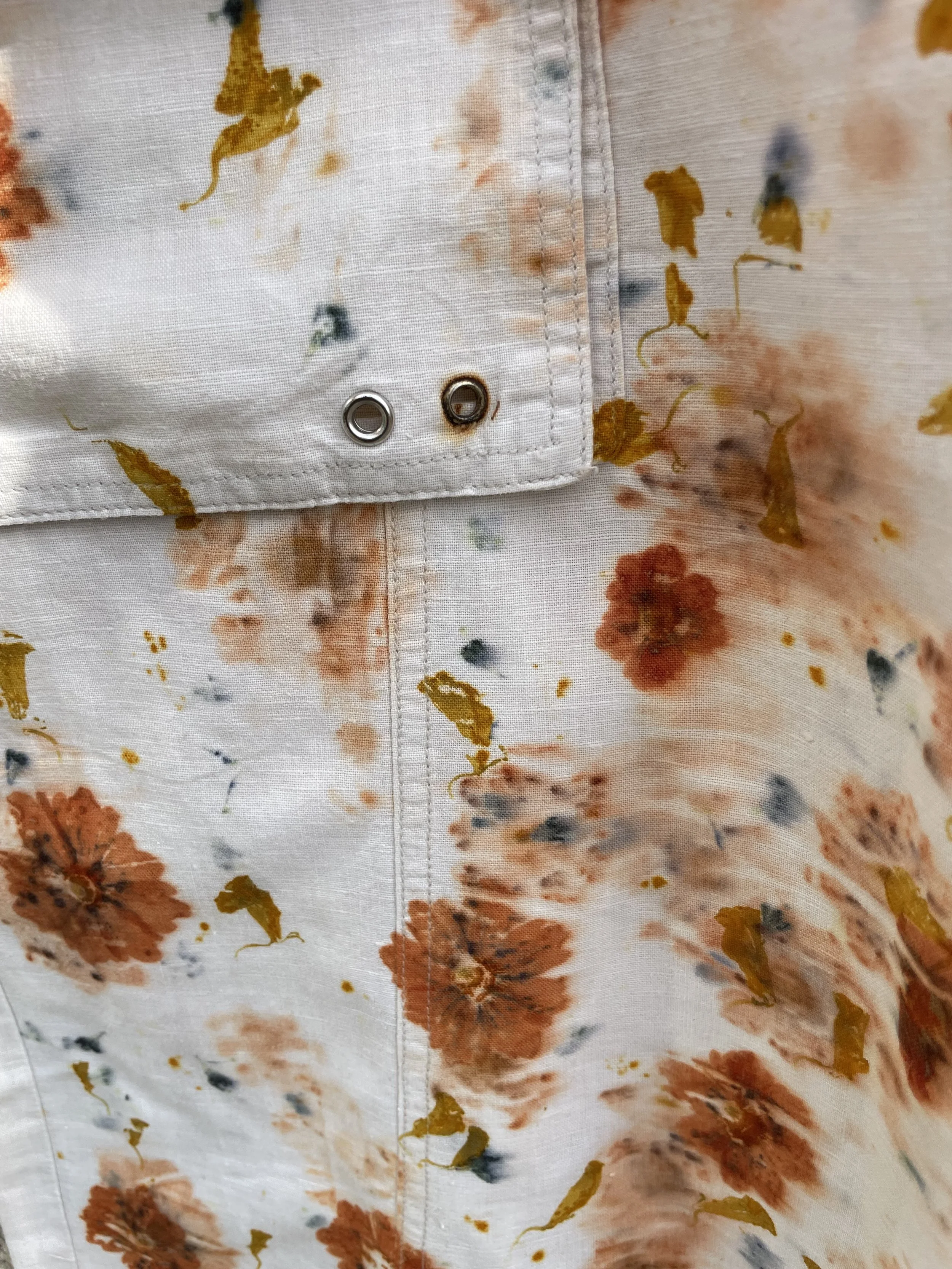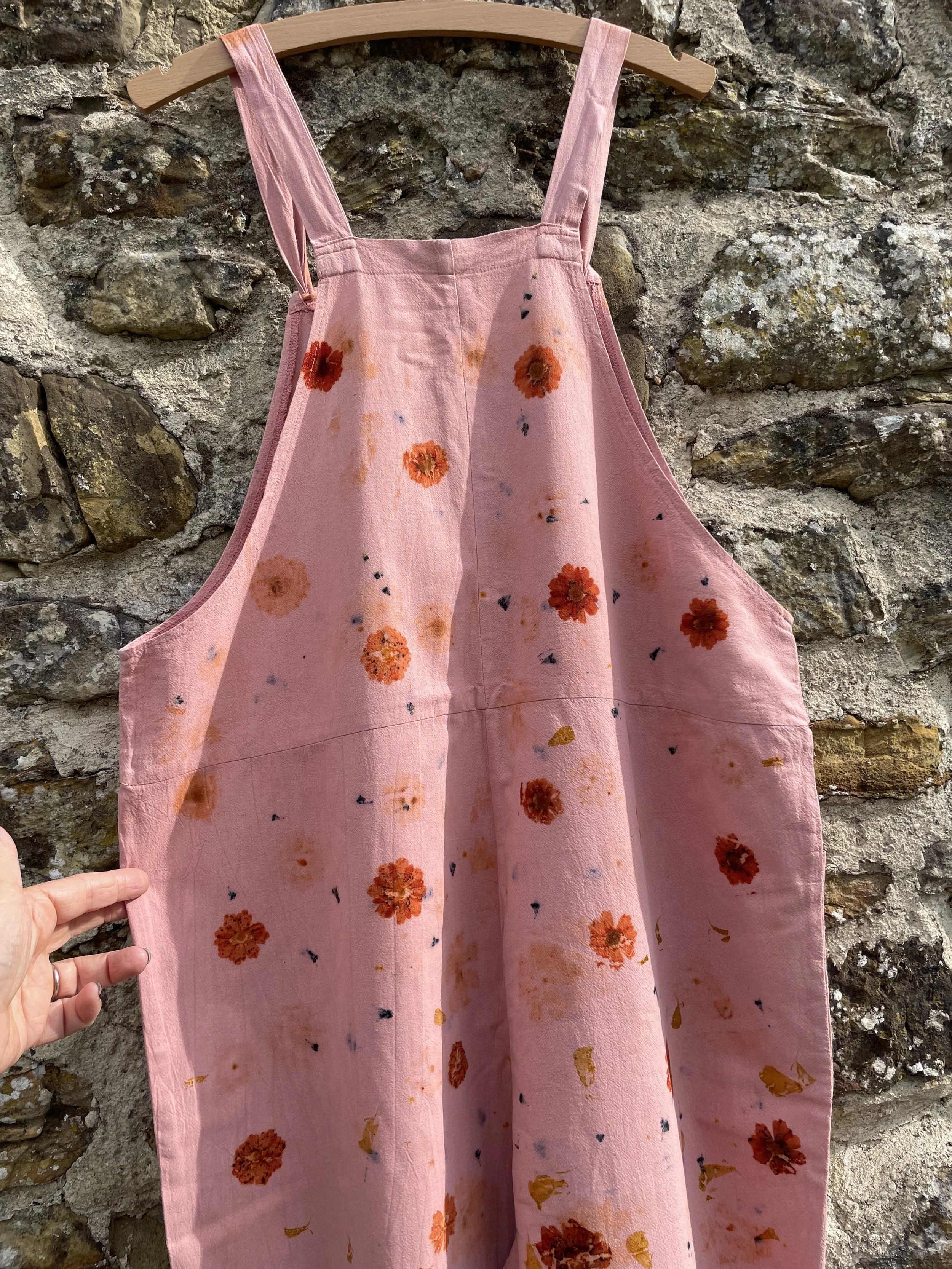 This 100% cotton T shirt has been given a new lease of life with flowers! It has been eco printed with just simple Coreopsis flowers, from my dye garden here in Fairlight by the sea.