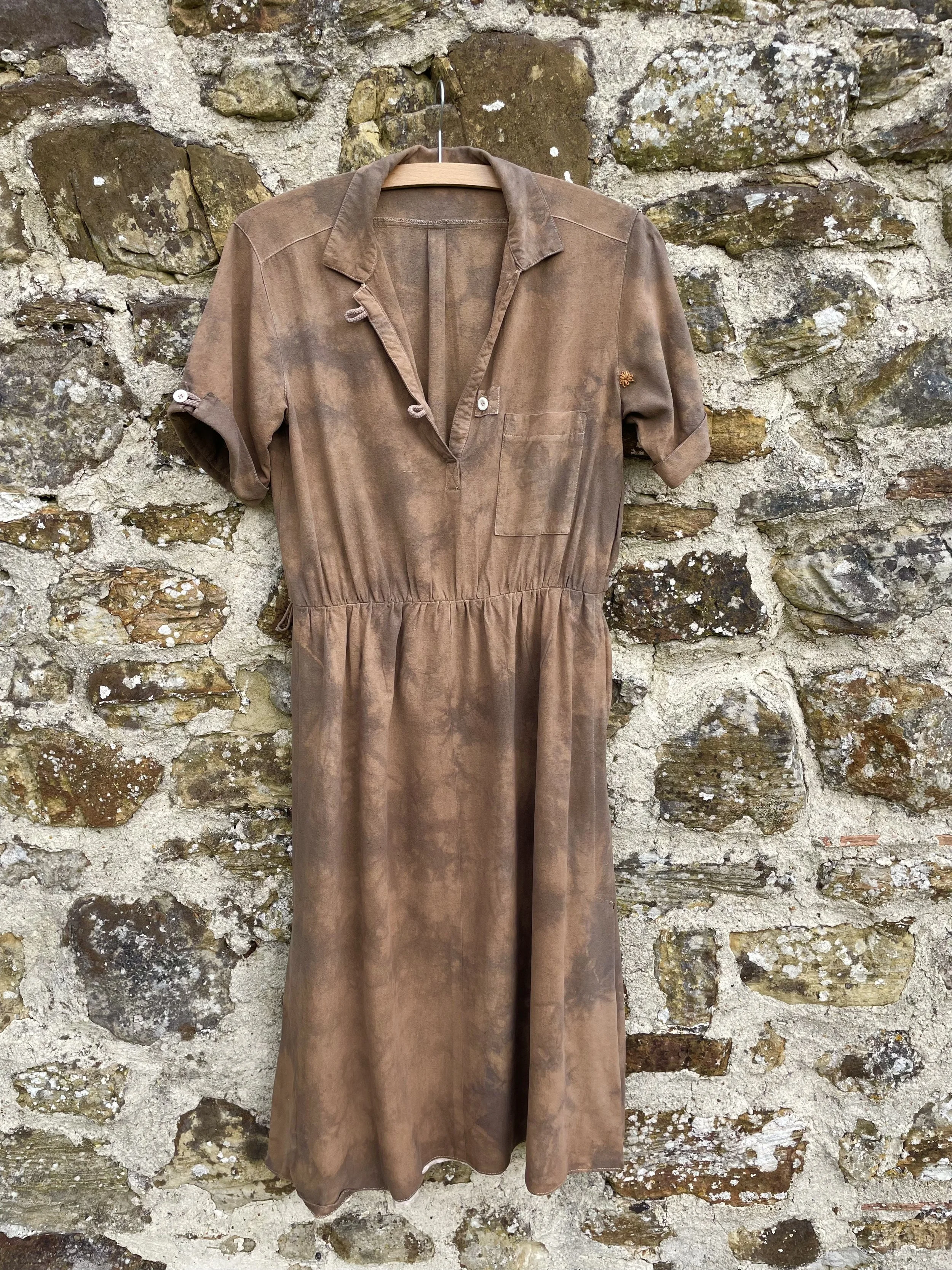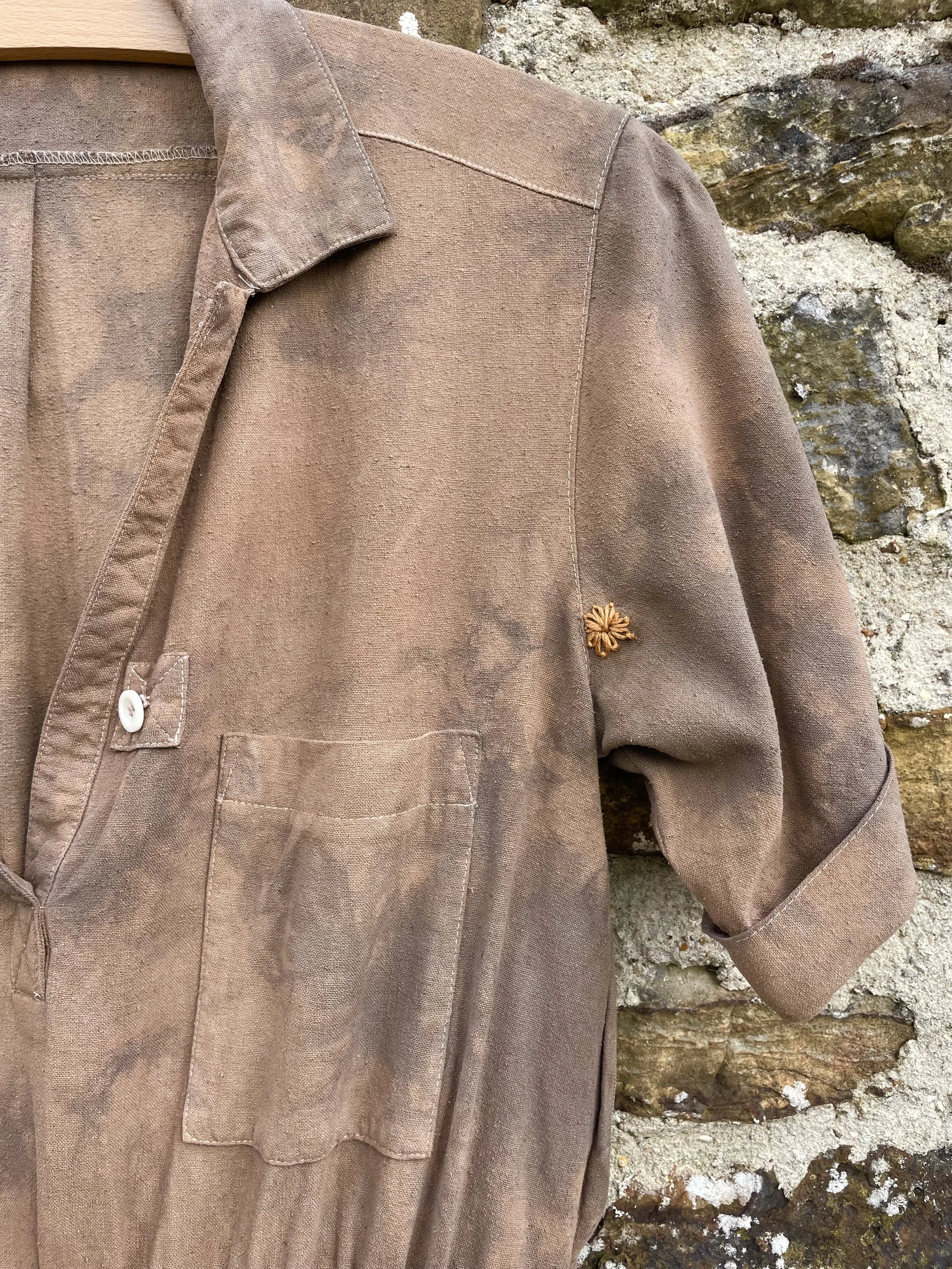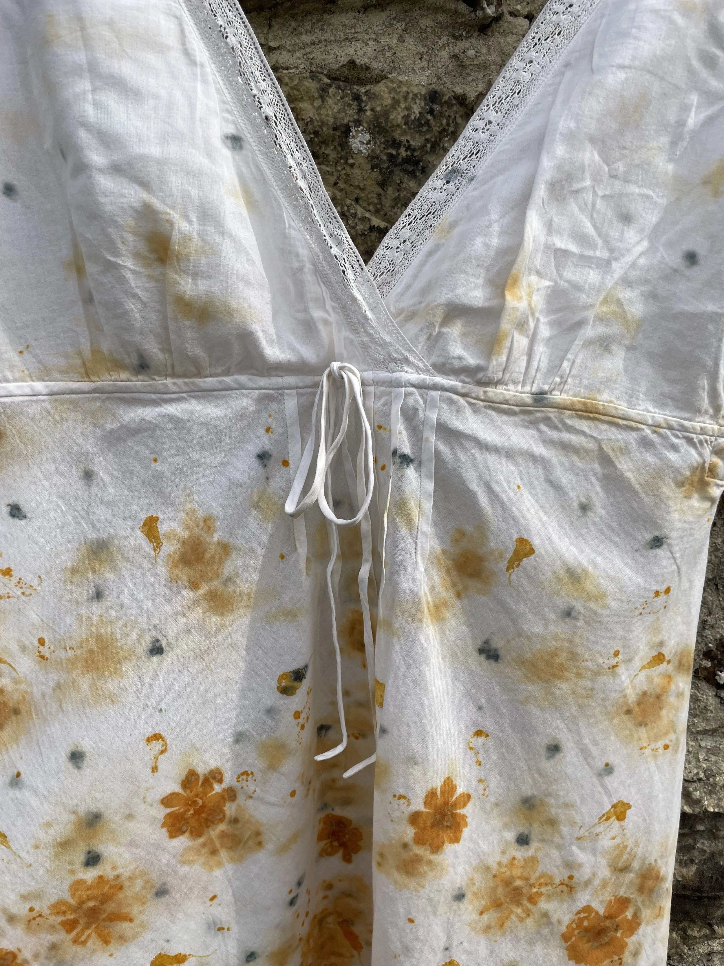 The flowers of Coreopsis really are the queen of eco printers and this simple T shirt shows them off at their best. Great with a pair of jeans. It is a size 10-12 and measures approx 45cm/18 inches across the chest. It is a slim fit with a slash neck and ¾ length sleeves.