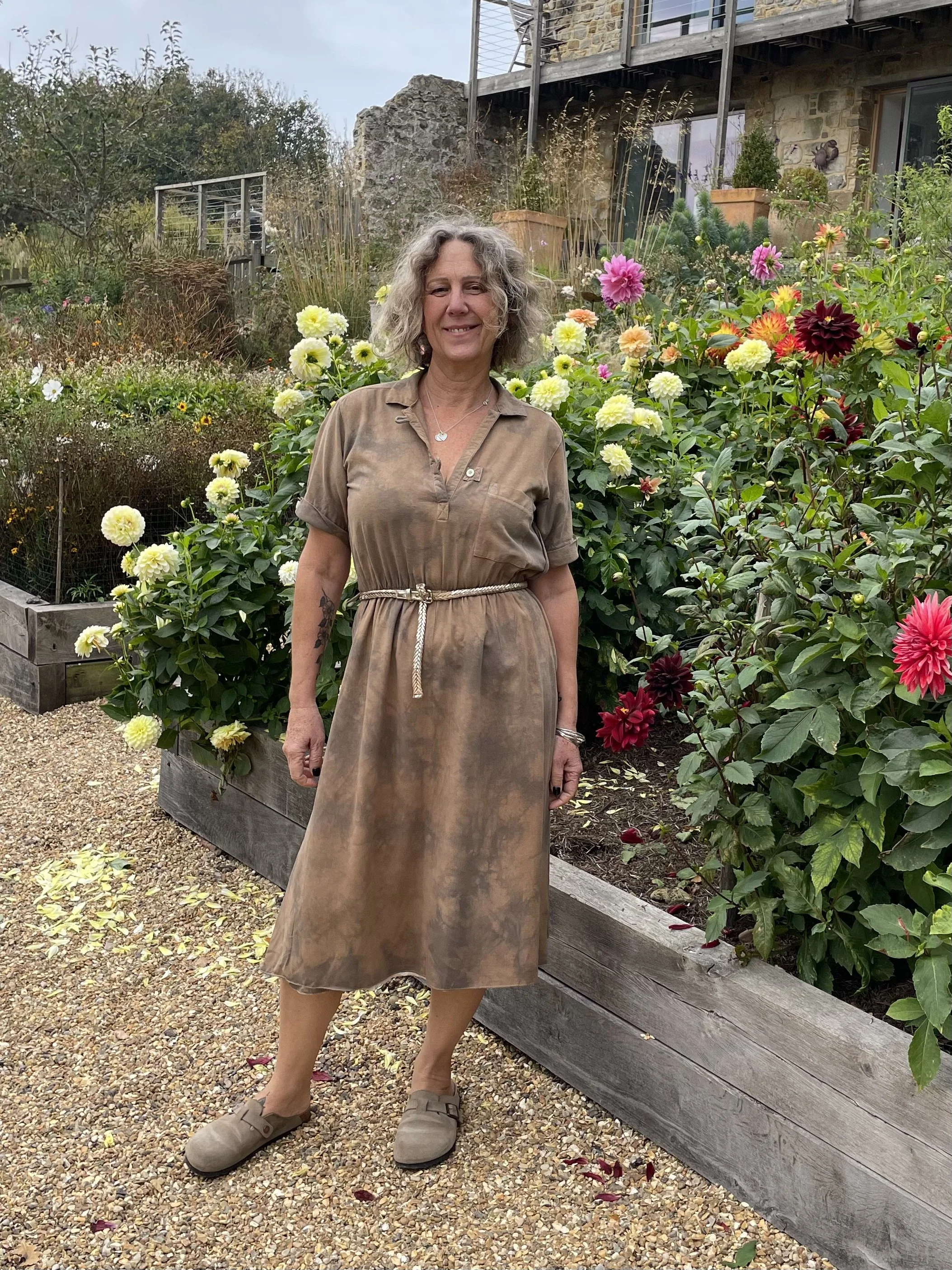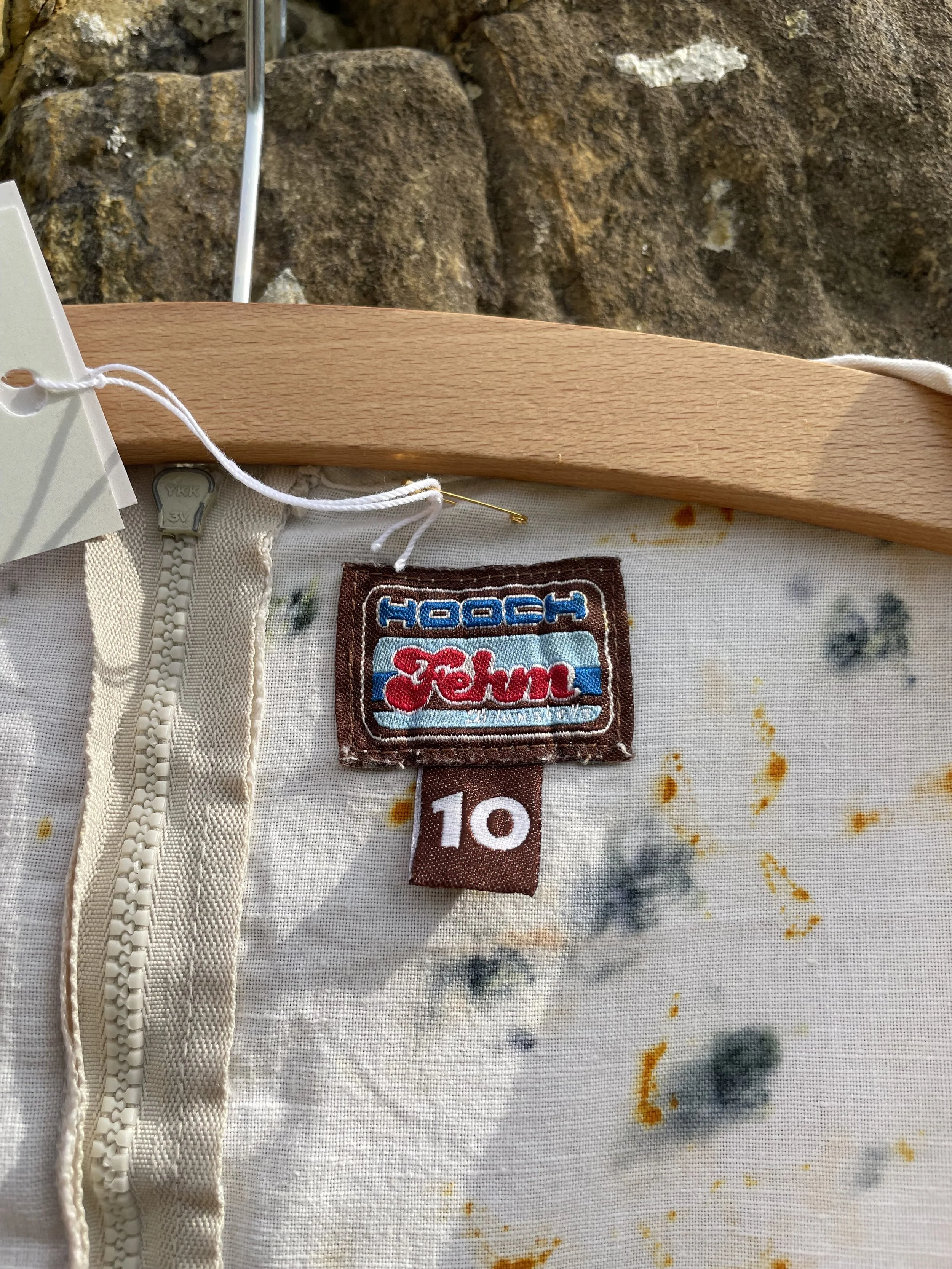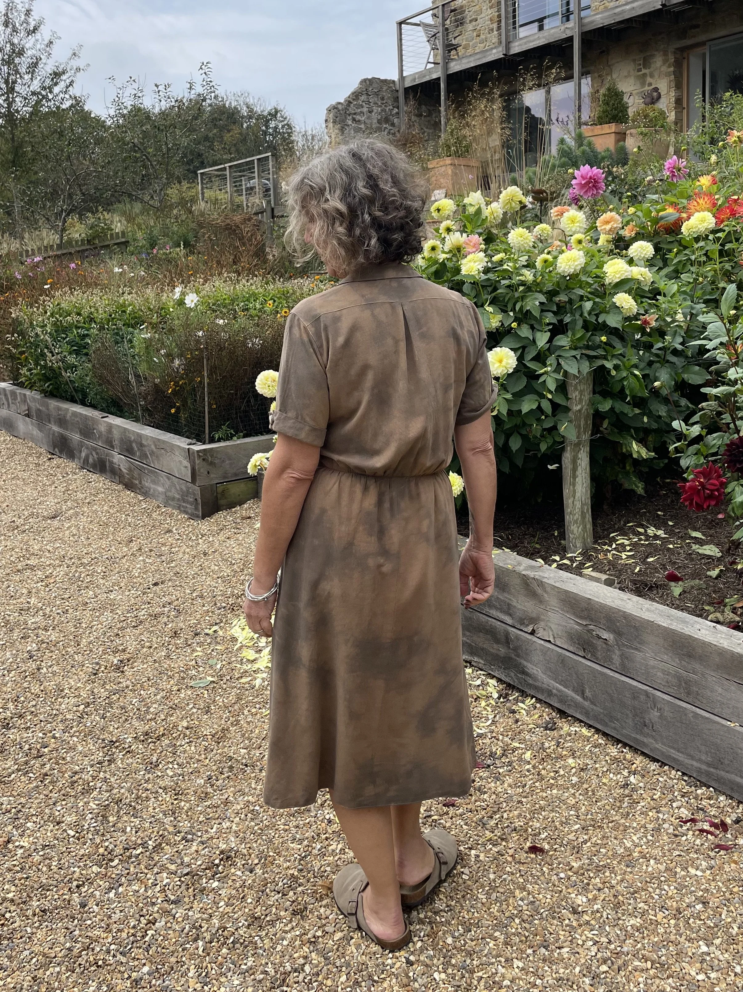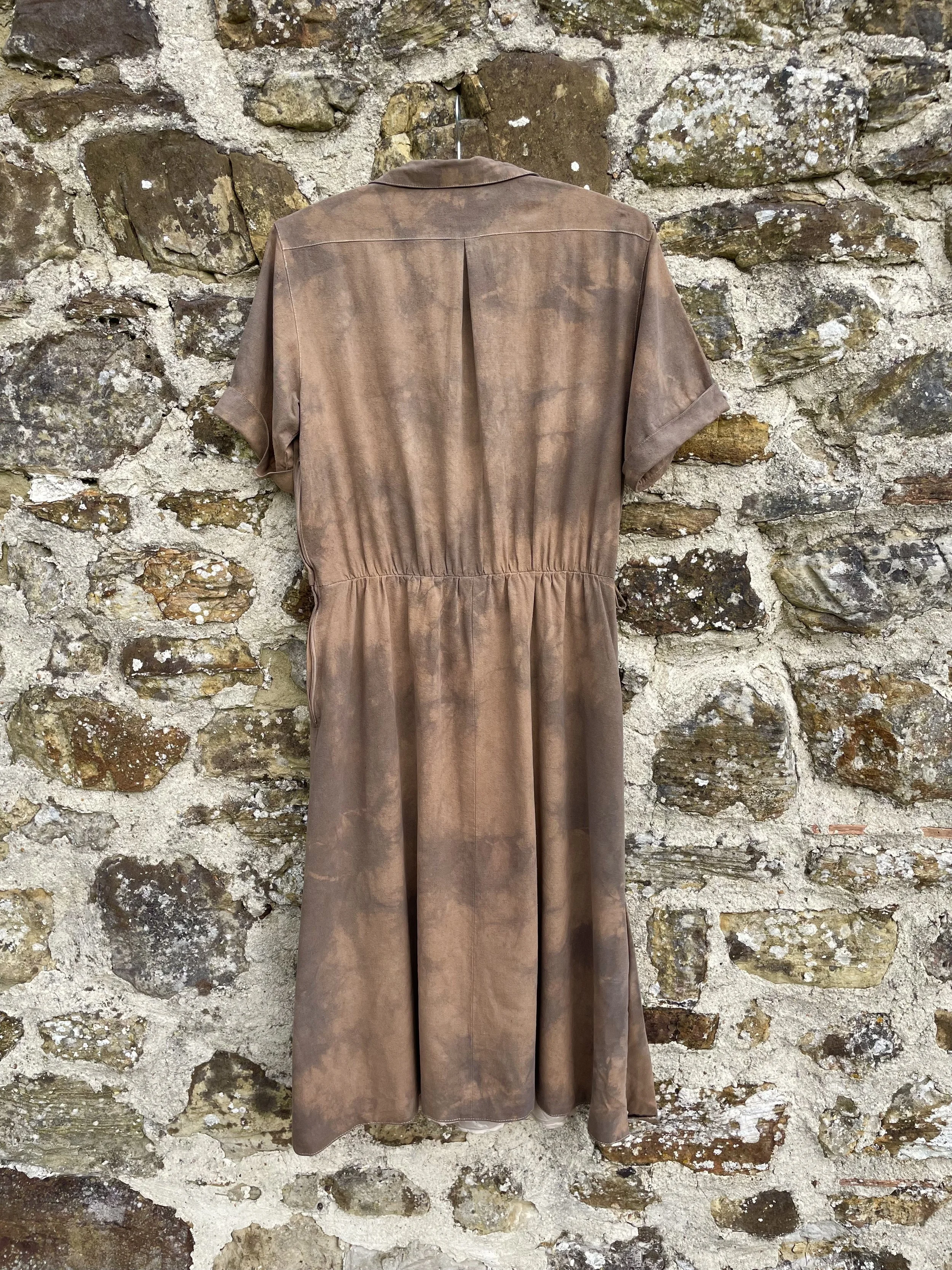 The flowers of Coreopsis really are the queen of eco printers and this simple T shirt shows them off at their best. Great with a pair of jeans. It is a size 10-12 and measures approx 45cm/18 inches across the chest. It is a slim fit with a slash neck and ¾ length sleeves.